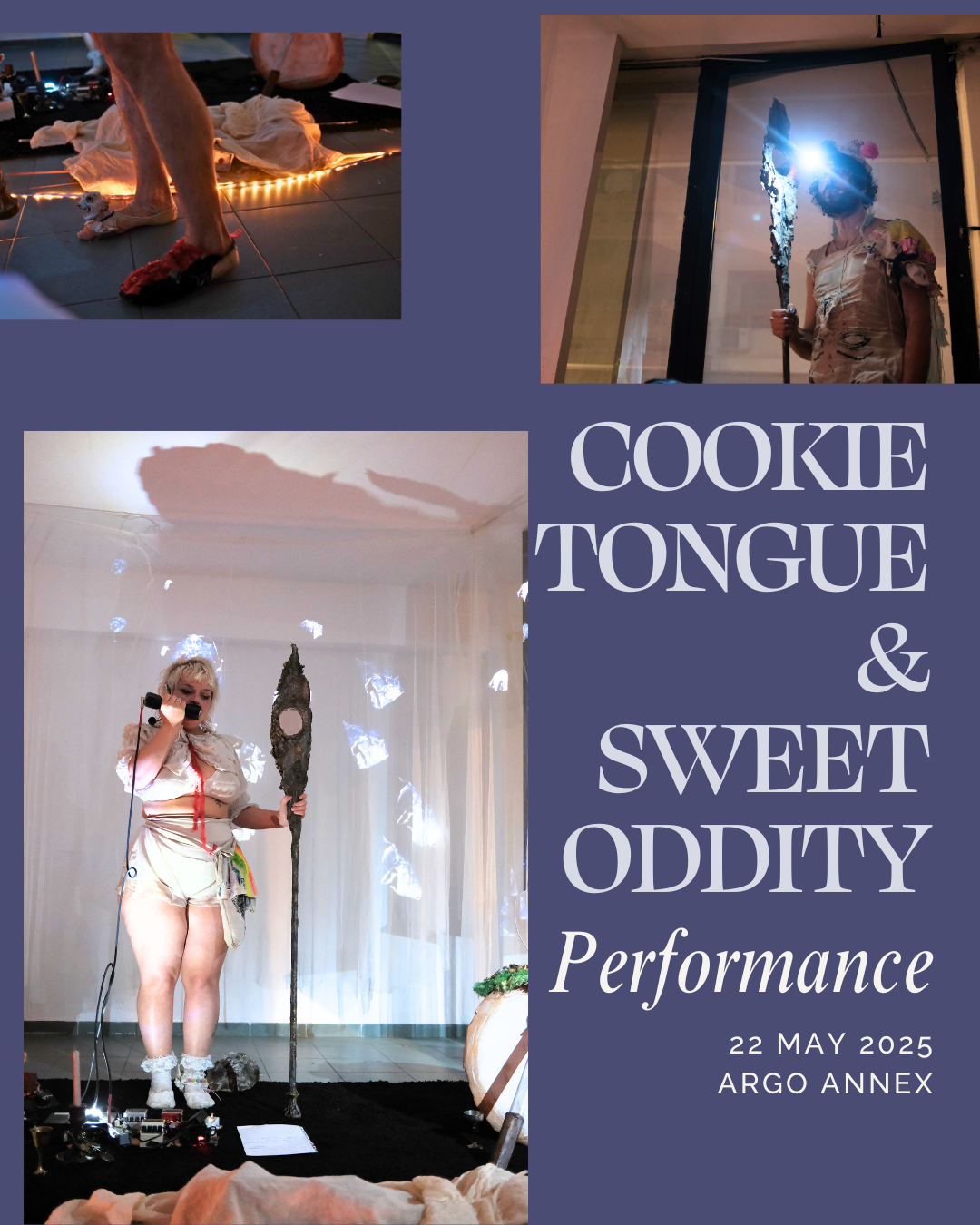 a multimedia ritual performance using music, costume, art objects, puppets and stop motion animation to create an immersive theatrical experience. A brand new collaboration by Argo Annex guest artists Cookie Tongue & Sweet Oddity.