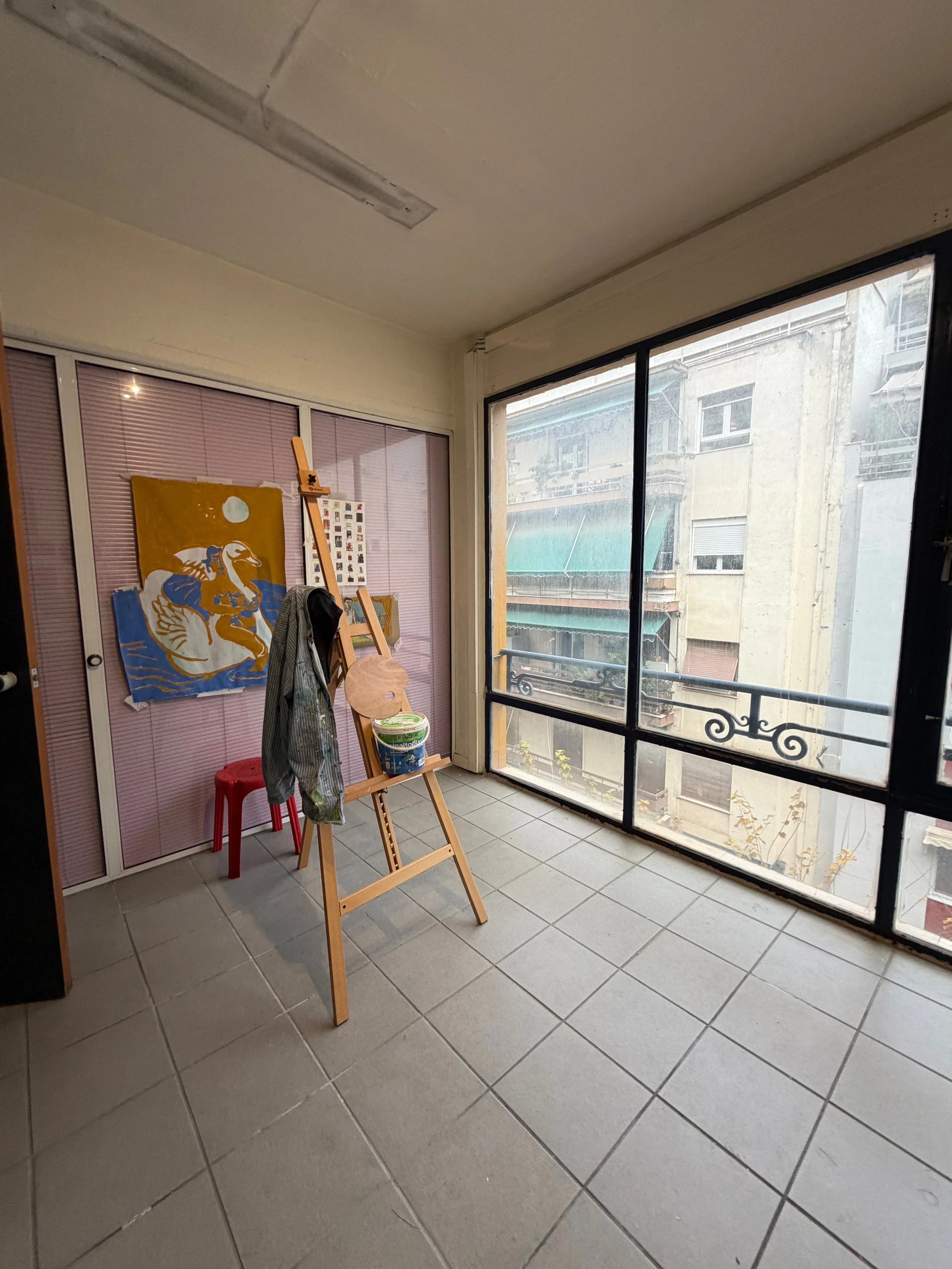We have private and shared studios, a store of basic materials, a woodshop, a kitchen, a library for quiet working or reading, and endless Athenian light.