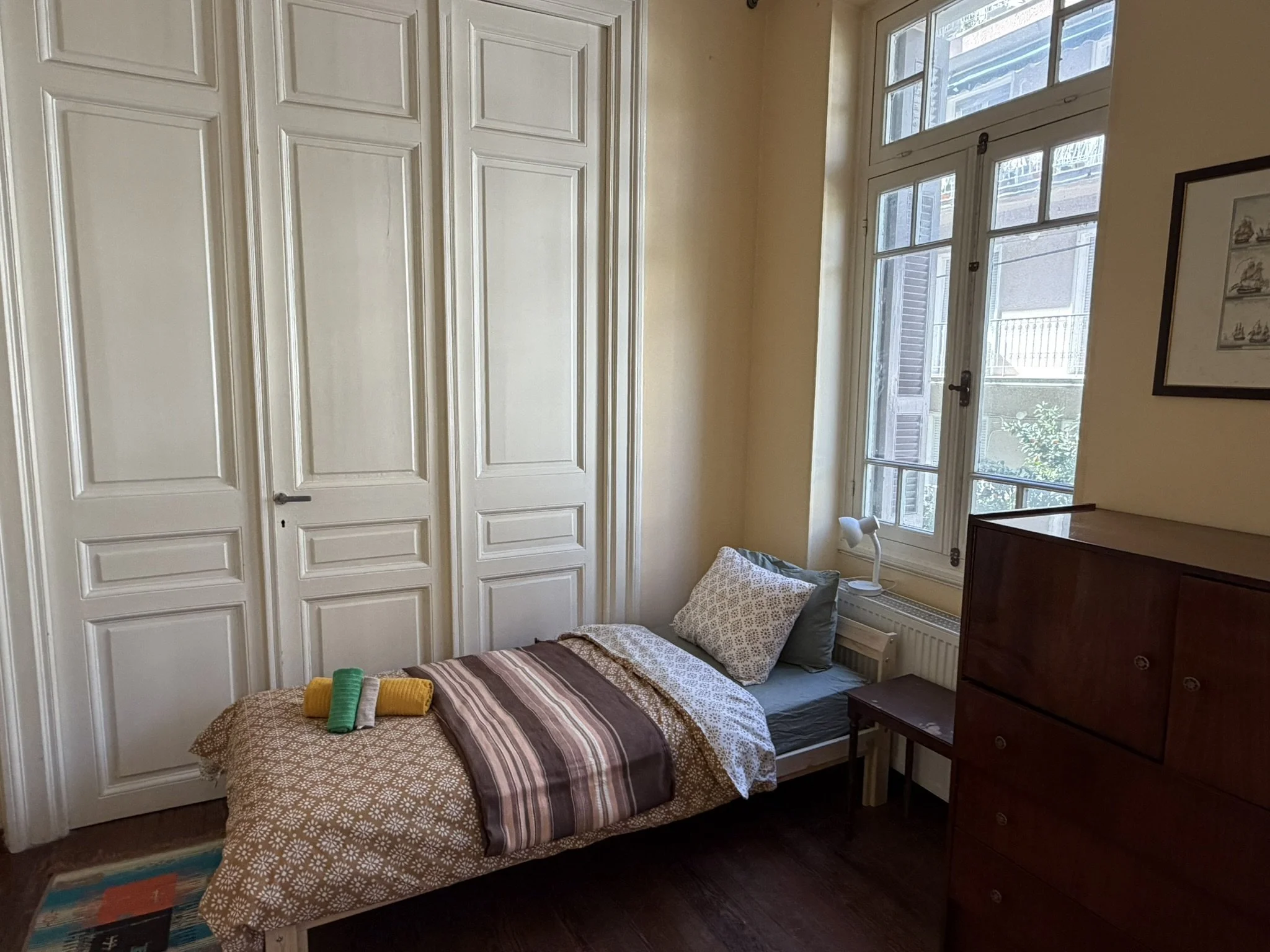 Housed in the nearby neighborhood of Kypseli, the accommodations (which we half-jokingly call “the Mansions”) are spread across two apartments in a gorgeous neoclassical building from 1928. There are two bathrooms, two kitchens, a sumptuous living room (with a carved archway), and two balconies overlooking the square, where we expect you’ll sit for all your spontaneous shared snacks and evening chats.