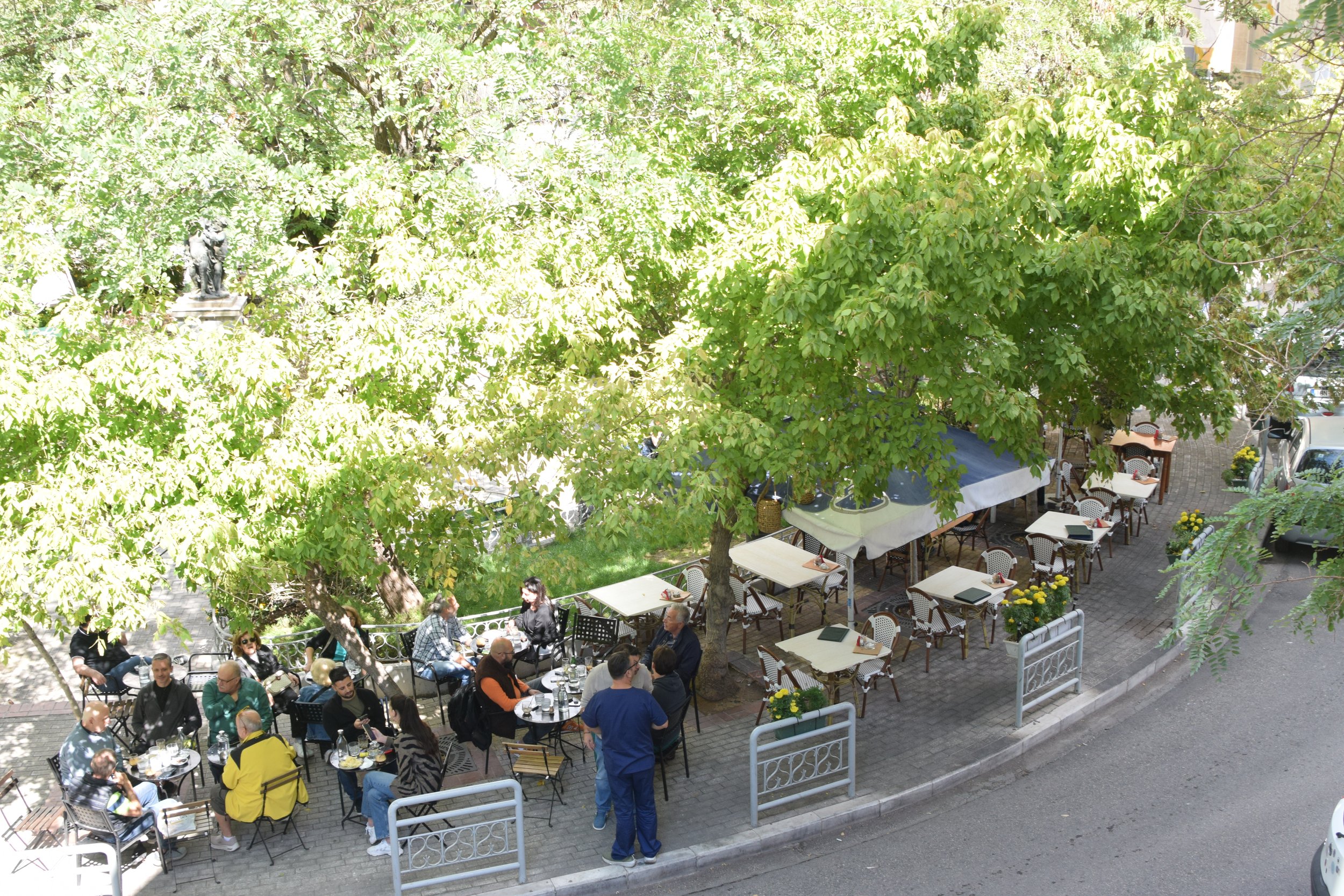 The building stands on the corner of Plateia Agiou Georgiou, a bustling and lovely square (that is actually a circle) full of bars, cafes, and restaurants bordering an impressive cathedral. On weekends especially, this circular square fills up with local families having hours-long Sunday lunches, and young people drinking freddo espressos late into the evening.